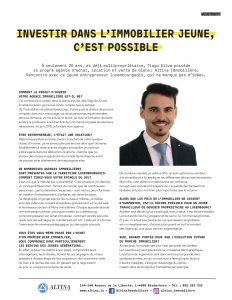 Tiago Silva, son gérant diplômé en immobilier, a lancé une série de vidéos à destination du grand public. À travers plusieurs épisodes, l’objectif d’Altina Immobilière est d’éclaircir certains points afin que chacun puisse entreprendre ses démarches immobilières en toute sérénité. Tiago Silva vous propose de partager avec vous sa connaissance du marché immobilier luxembourgeois sur différents sujets afin de rendre le domaine immobilier plus accessible.